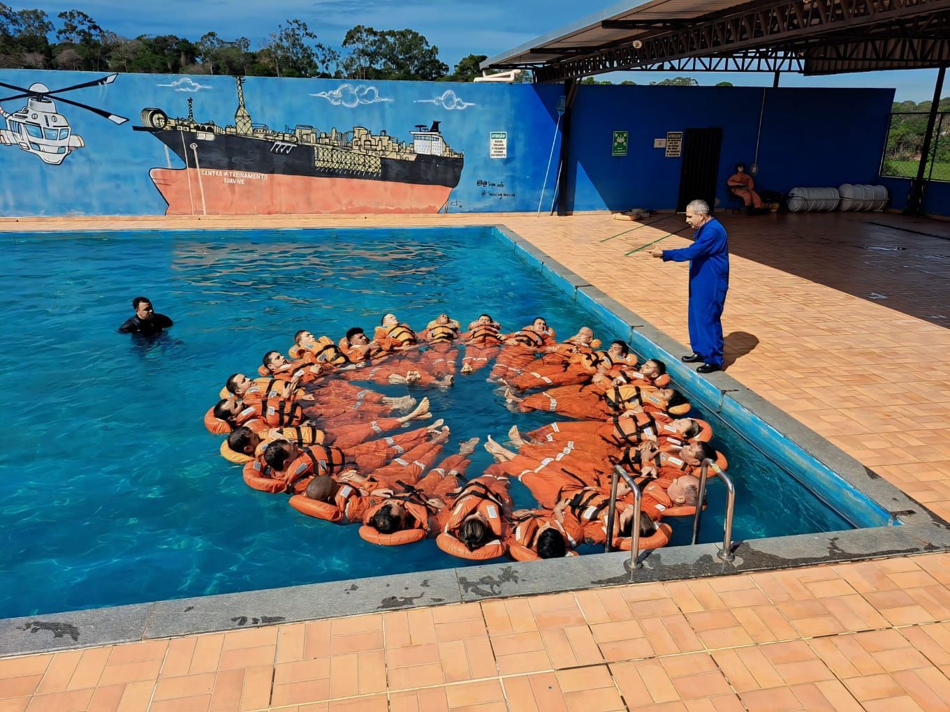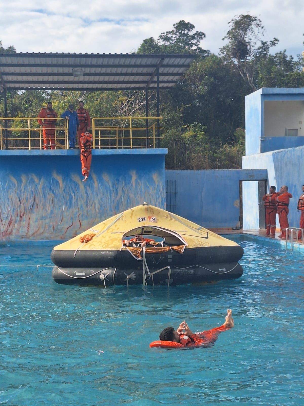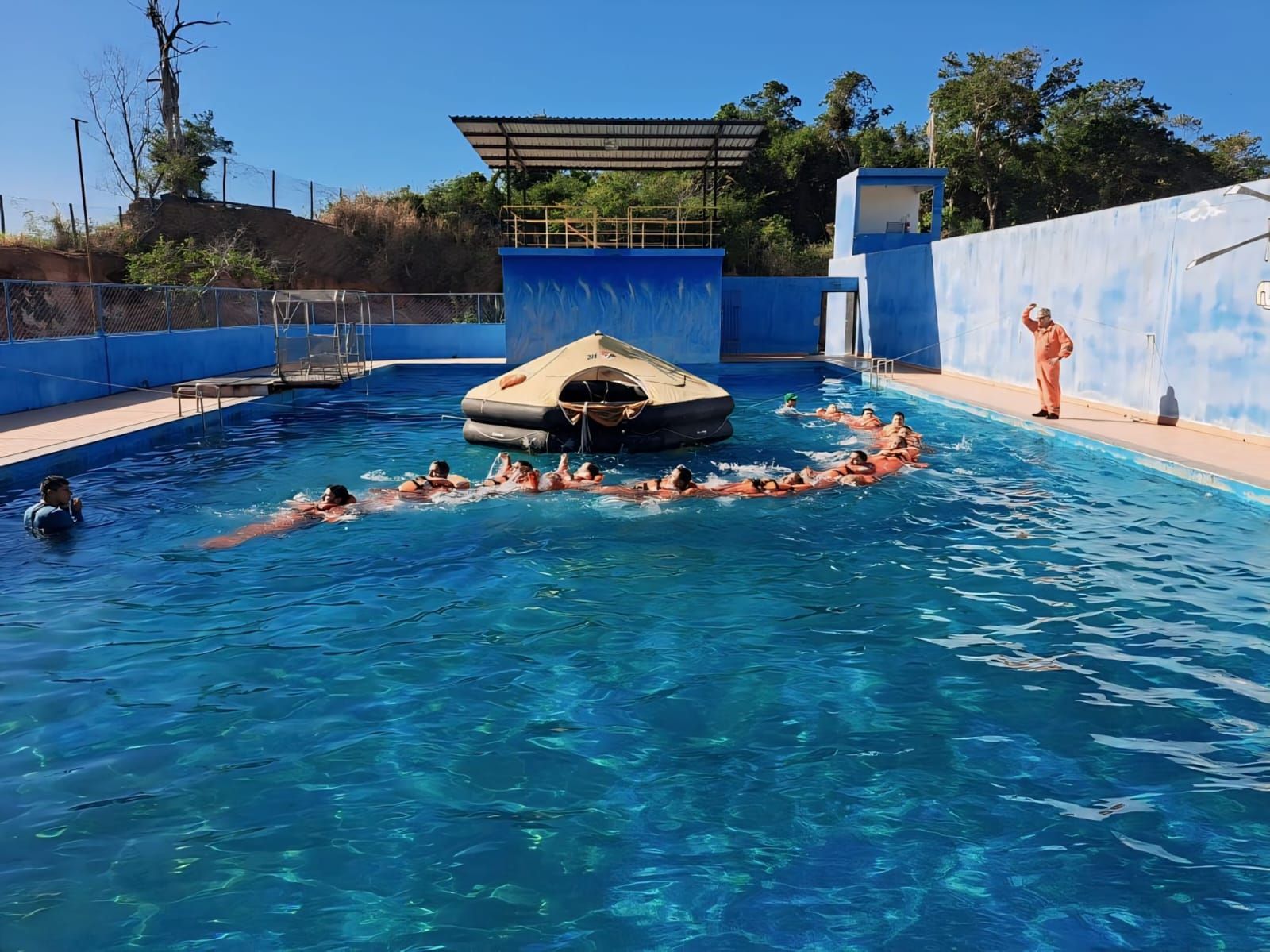 Nossa estrutura para treinamentos aquáticos conta com piscina semiolímpica, baleeira, balsa, além de coletes salva-vidas, boias, cabos, cordas e diversos equipamentos de salvatagem.